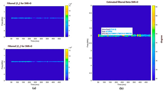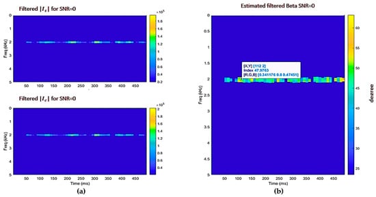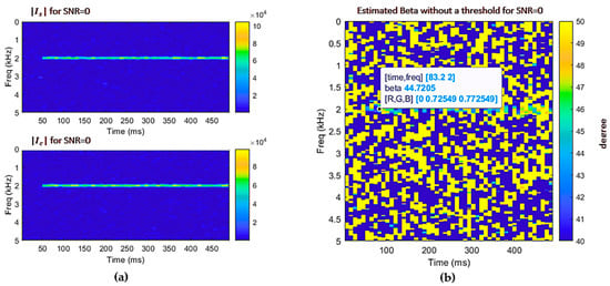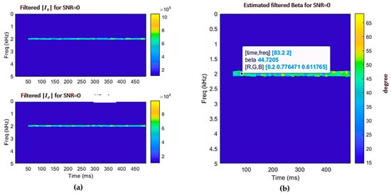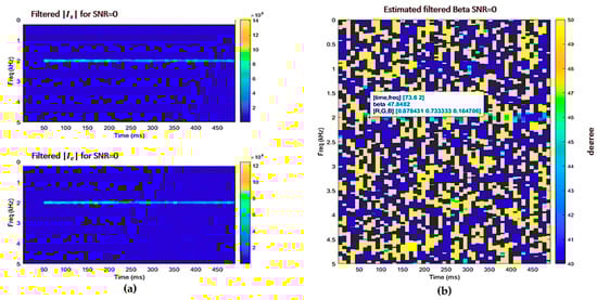 Sometimes, the original signal becomes so entangled with noise that they are thoroughly blended and challenging to distinguish. In the literature, the barrage jamming signals, which are intentionally interfered by the enemy jammer radar, are usually assumed to be Gaussian distributed. For this reason, in this paper, we will evaluate the results by adding Gaussian white noise to the original signal. Figure 5a depicts the spectrogram of the received signal with an SNR of zero dB, where the power of the signal equals that of the noise, in the sinusoidal and cosine channels. The horizontal axis represents the time, while the vertical axis represents the frequency. Notably, the frequency of the signal remains constant at 2 kHz throughout the observed time span.