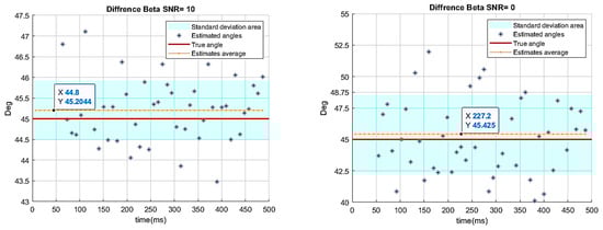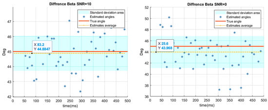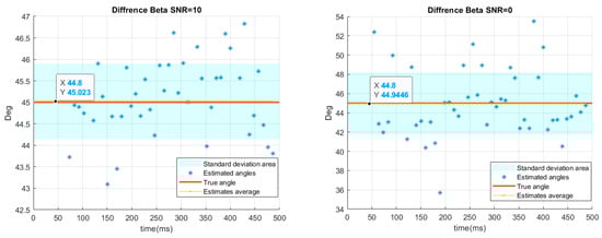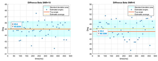 The orange line illustrates the source’s presence at a 45-degree angle initially; then, due to its speed and changing position, the angle fluctuates. It is observed that at SNR = 0 dB, the standard deviation ranges from about 42.9 to 49 degrees, with an average of 45.8648 degrees. At SNR = 10 dB, the standard deviation range is from 44.4 to 46.6 degrees, with an average of 45.49 degrees.