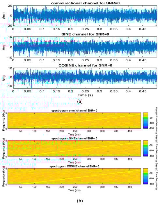 (a) Depicts the short-time Fourier transform (STFT) spectrum of different channels corresponding to a variable frequency source. (b) Shows the signals received in different channels in the time domain. SNR = 0 dB.