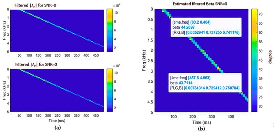 In certain scenarios, variable frequency sources may be encountered. To illustrate the outcomes of the proposed method under such conditions, we conducted a simulation employing a cosine signal with a frequency that changes over time. The results at an SNR equal to zero dB are presented in Figure 9. Figure 9a displays the spectrogram of the signal received by the omnidirectional, sine, and cosine channels, showcasing the dynamic frequency changes over time. By deriving the azigram matrix and subsequently applying an appropriate filter, the presence angle of the source becomes distinctly identifiable (refer to Figure 10).