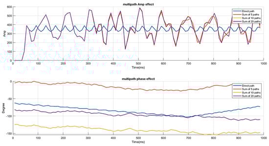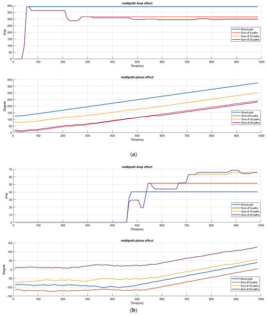 In Figure 13a, we assume that the transmitter and receiver shown in Figure 12 are located approximately 70 m apart. Subsequently, we increase this distance to 700 m. Finally, in Figure 14, we illustrate the effect of the channel on the amplitude and phase of signals when the transmitter and receiver are at a distance of approximately 70 m, and the transmitter is moving at a speed of 20 km/h. The blue curve in the figure represents the signal passing through a straight path. Comparing this curve with others depicting the sum of the signals affected by a multipath channel reveals the impact of the channel. By comparing Figure 13a,b, which showcase the sum of the number of signals received by the receiver according to the change in the number of paths, it becomes apparent that increasing the distance results in a delay in the signals received by the receiver, leading to changes in the amplitude and phase.