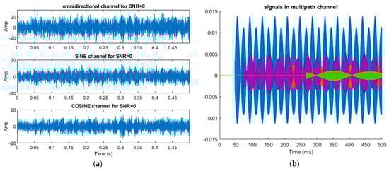 (a) Single-frequency cosine signals from a moving source passed through a multipath channel. (b) Time signals that arrived at omnidirectional, sinusoidal and cosine receivers from a moving source with a fixed frequency cosine signal in a multipath channel. Different colors represent different signals.