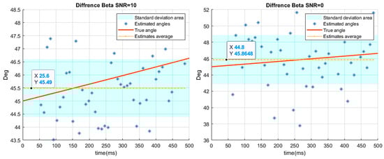 However, to assess the system’s performance in the presence of varying levels of noise, we also examine the system’s response under different SNR conditions, the results of which are shown in Figure 20. In this figure, as previously mentioned, the angle changes over time, starting from 45 degrees due to the source’s initial position.