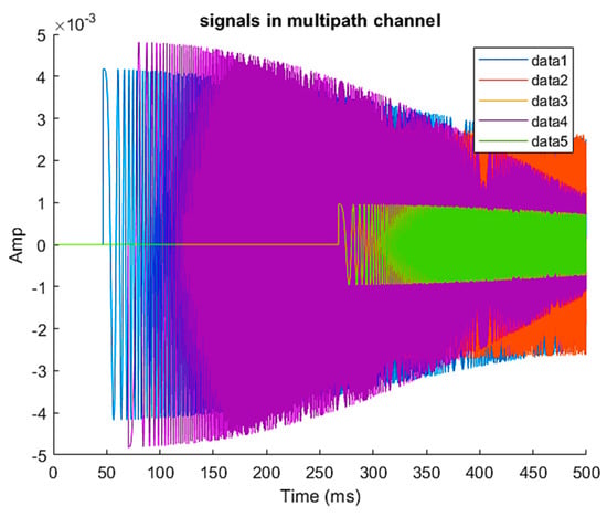 Figure 21 displays the signals, considering the impact of the multipath and frequency changes over time. These signals, mixed with noise, reach the receiver in the time domain. As anticipated, due to the predetermined number of paths (five paths), five signals are evident.
