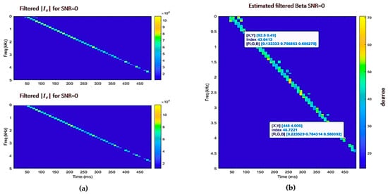 In Figure 14, the effect of altering the transmitter’s speed on the amplitude and phase of the signals collected by the receiver is depicted. This figure reveals the performance of the multipath channel and the amplitude and phase changes induced by the channel compared to a direct path. Subsequently, we examine the algorithm implemented in this channel. A cosine signal with a frequency of 2 kHz is transmitted to the receiver. The objective is to estimate the azimuth angle using the algorithm introduced in Section 3. The source angle is assumed to be 45 degrees, and five paths are considered. This implies that the receiver receives the superposition of five signals that have traversed different paths with applied losses. By utilizing the relationships outlined in Section 3 and obtaining the active intensity of the sine and cosine channels (Figure 15a), the azigram matrix is constructed (Figure 15b). The index in this matrix represents the estimated angle, with the horizontal axis representing the time and the vertical axis representing the frequency. Similarly to the previous examples, the outputs of the thresholding filter are depicted in Figure 16.