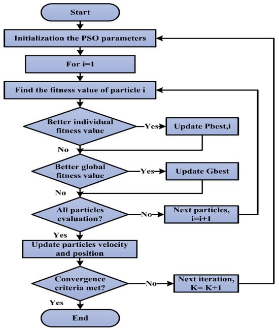 where, is points taken from the datasheet I–V curve. In this study, the PV cell’s single-diode configuration’s unknown parameters were determined using the PSO. In this case, we will assume the five parameters of the PV cell (, , , , and ) are unknown and use PSO in MATLAB to try to determine the actual value or best values of these parameters. By using mathematical modeling, we first collect voltage and current data at discrete places and use these values as input parameters for the characteristic equation of the single-diode configuration in PV systems. This procedure yields the previously unknown parameters. The PSO method’s flow chart, which is used to extract the PV cell parameter, is shown in Figure 4. Additionally, Table 1 displays the PSO algorithm’s parameter values, which can be initialized here.