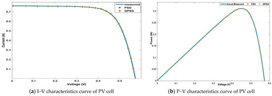 The I–V and P–V characteristic curves of a single-diode PV cell are shown in Figure 5a,b, along with a comparison to the estimation parameters derived from the use of the suggested two-step GPSO methodology. Table 3 shows the compression between % relative change in a PV cell parameter value extracted using the proposed techniques and extracted parameter values in reference [11].