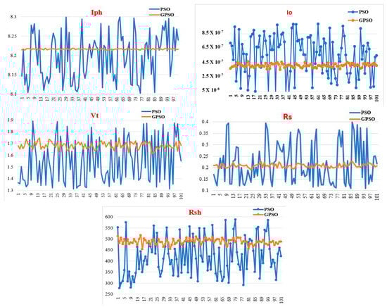 Figure 6 shows the estimated parameter (, , , . and ) values using PSO and GPSO for each iteration. A total of 101 values show the mean values of the parameter values obtained in 100 iterations. The best parameter values for PSO showed more variety when we analyzed all iterations. As a result, using PSO to establish the ideal parameter value can be difficult. To overcome this problem, we presented two-stage optimization methods in this paper. The parameter value extracted using the proposed two-step optimization technique was compared to the GA and PSO approaches; the fluctuation in the optimal parameter values in each iteration was less.