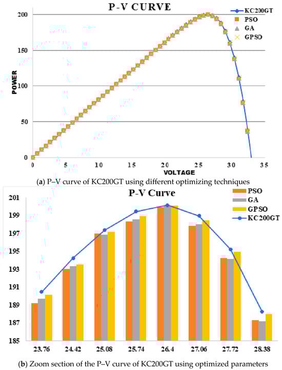 Figure 7a,b shows the output PV curve of the KC200GT PV module using PSO, GA, and GPSO. The performance of the proposed GPSO-based optimization techniques was better compared to other optimization techniques.