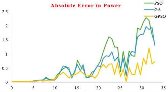 The relative error for power was calculated for GA, PSO, and GPSO methods to determine the efficacy of the suggested model. Comparisons were made between GA, PSO, and GPSO approaches and other methods in the literature about the relative error in computed power. Relative error for power () is computed using Equation (33) as follows: