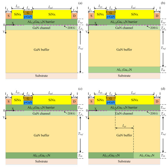 The structure of the conventional p-GaN gate GaN HEMT (Conv HEMT) is shown in Figure 1a. The structures of the p-GaN gate GaN HEMT with a single AlGaN back barrier (B-HEMT) are depicted in Figure 1b,c, with the aluminum composition (Al.comp) of the AlGaN back barrier set to 0.1 and 0.25, respectively. Figure 1d illustrates the proposed HBB-HEMT, in which the hybrid AlGaN back barrier consists of an Al0.25Ga0.75N region and an Al0.1Ga0.9N region, and the Al0.25Ga0.75N/Al0.1Ga0.9N interface is set between the gate and the drain. The above four structures consist of a Si(111) substrate, GaN buffer layer, GaN channel layer, Al0.26Ga0.74N barrier layer, and p-GaN layer doped with 3 × 1017 cm−3. Table 1 provides the key structural parameters for the HBB-HEMT. For the HBB-HEMT, the Al0.25Ga0.75N/Al0.1Ga0.9N interface location (Lgi), the thickness of GaN buffer (Tbuf), and gate-to-drain distance (Lgd) have been optimized.