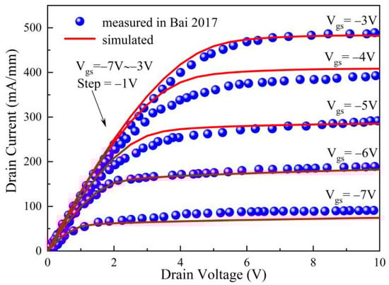 We fabricated a D-mode GaN HEMT to fit the simulation model [31]. The epitaxial structures with a dislocation density of 109 cm−2 were grown on Si substrates. The epitaxial structures consisted of a 4 nm thick GaN cap layer, a 21 nm thick AlGaN barrier layer, and a 3.2 µm thick GaN buffer layer. First, a 20 nm thick SiNx was grown as the gate dielectric by low-pressure chemical vapor deposition (LPCVD), which was selectively etched into the gate pattern by inductively coupled plasma etching (ICP-RIE) using SF6 mixed gas. Then, sputtered Ni/Au was deposited on the gate dielectric SiNx as the gate electrode. The Ti/Al/Ni/Au stack was deposited and rapidly annealed at 870 °C to form the source and drain ohmic contacts. A 150 nm thick SiNx was formed on the GaN cap layer for passivation and argon ion implantation for isolation. The gate width, gate length, gate-to-source distance, and gate-to-drain distance of the fabricated transistor were 250 µm, 2 µm, 2 µm, and 2 µm, respectively. The structural parameters used in the simulation were the same as those in the experiment. The fabricated D-mode GaN HEMT was tested by the Agilent B1505 and its test data were used to fit the models described above. The simulated threshold voltage (Vth) of GaN HEMT was −7.8 V, which is consistent with the experiment. Figure 2 presents the simulated output characteristics and the fabricated GaN HEMT output characteristics. The results demonstrate a good fitting, which proves the reliability of the simulation models for GaN HEMTs.