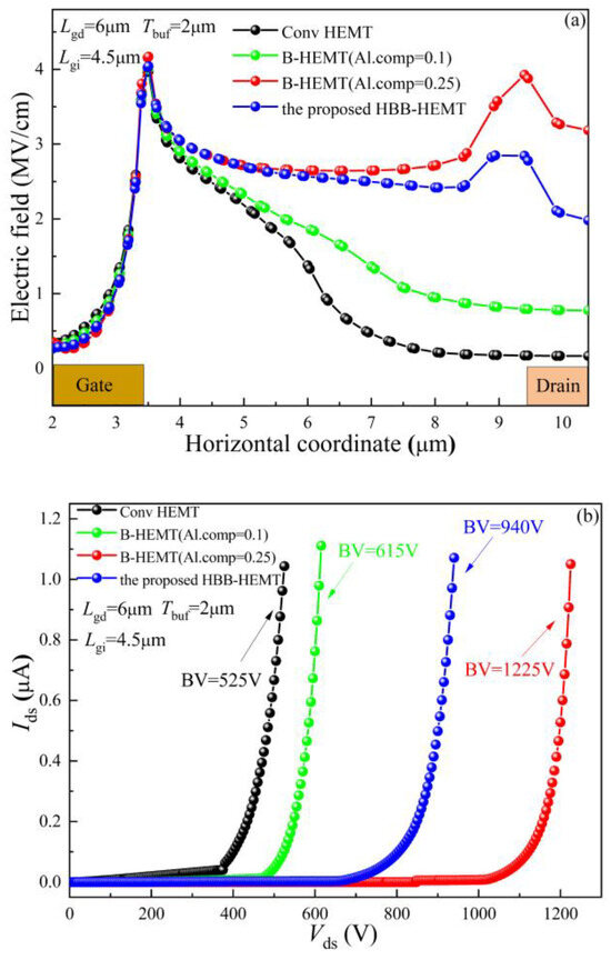 Figure 5a illustrates the one-dimensional electric field distribution in the channel of four devices when breakdown occurs. Electric field crowding occurs in the Conv HEMT and B-HEMTs. For Conv HEMT and B-HEMT (Al.comp = 0.1), the electric field peak is on the gate side. For B-HEMT (Al.comp = 0.25), another peak appears on the drain side, which is consistent with the results reported previously [18]. Figure 5b displays the breakdown curves of four GaN HEMTs, where Vgs is set to −3 V during the breakdown simulation. The BV of Conv HEMT is identified as 525 V, which is similar to the reported result of 510 V with similar dimensions [32]. The breakdown voltages are determined as follows: 615 V for B-HEMT (Al composition = 0.1), 940 V for B-HEMT (Al composition = 0.25), and 1225 V for the proposed HBB-HEMT, with BV defined as Vds at Ids = 1 μA/mm.