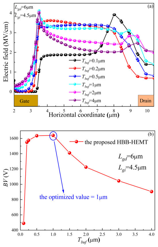 (a) One-dimensional distribution of electric field along the GaN channel and (b) breakdown voltage of GaN HBB-HEMTs vary with Tbuf.