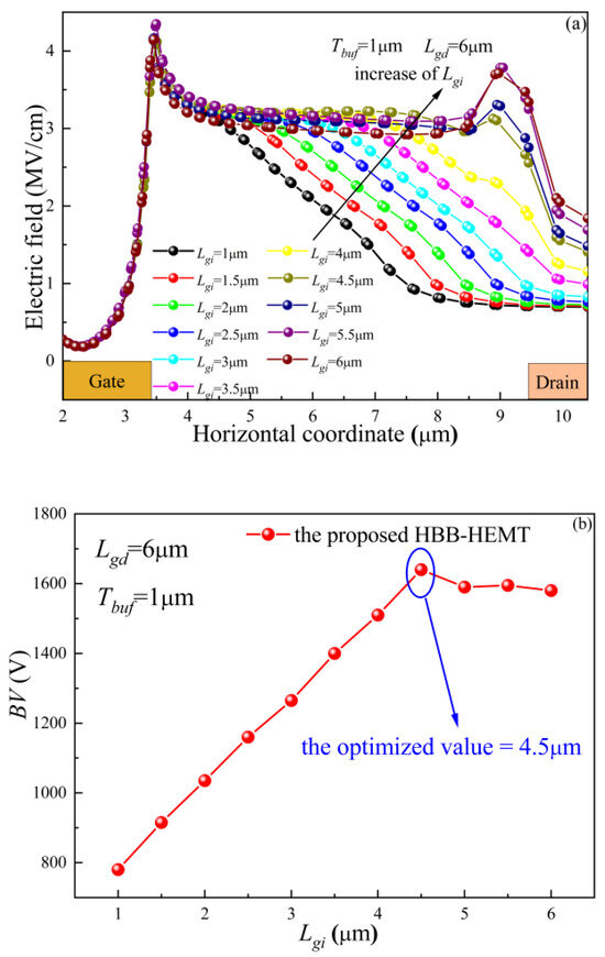 To further improve the withstand voltage capability of the HBB-HEMT, we optimized the position of the Al0.25Ga0.75N / Al0.1Ga0.9N interface. Figure 7a shows the distribution of the electric field in the channel for different Lgi values under breakdown conditions. For a given Lgd value, the electric field near the drain will decrease with a minuscule Lgi value, resulting in the overall average breakdown electric field in the channel far below the limit of the GaN. When the Lgi value is large, an electric field peak on the drain edge causes early breakdown, similar to what is seen in B-HEMT (Al.comp = 0.25) in Figure 5a. Figure 7b depicts the simulated breakdown voltage curves of HBB-HEMT with different Lgi values. As illustrated in Figure 7b, the breakdown voltage initially increases and then decreases as Lgi increases. The highest BV of 1640 V is achieved at Lgi = 4.5 μm.
