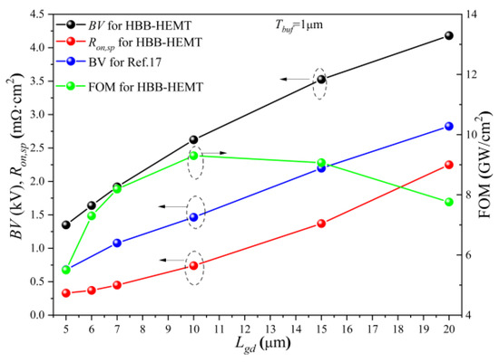 Breakdown voltages, Ron, sp, and FOM versus Lgd of the proposed HBB-HEMT devices.