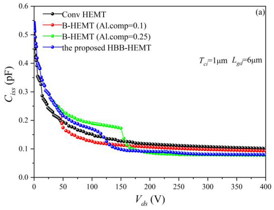 The CV characteristics of the HBB-HEMTs are shown in Figure 10. In the simulation process, we simulated the relationship between the input capacitance (Ciss), output capacitance (Coss), reverse transfer capacitance (Crss), and drain-source voltage (Vds). At low drain-source voltage, the depletion region near the gate is small, resulting in a larger capacitance between the gate and drain. As the drain voltage increases, the depletion region near the gate starts to extend towards the drain, causing the channel charges between the gate and drain to be depleted. Consequently, the Crss decreases with increasing drain voltage. This also applies to Ciss and Coss, because both capacitances include Crss: