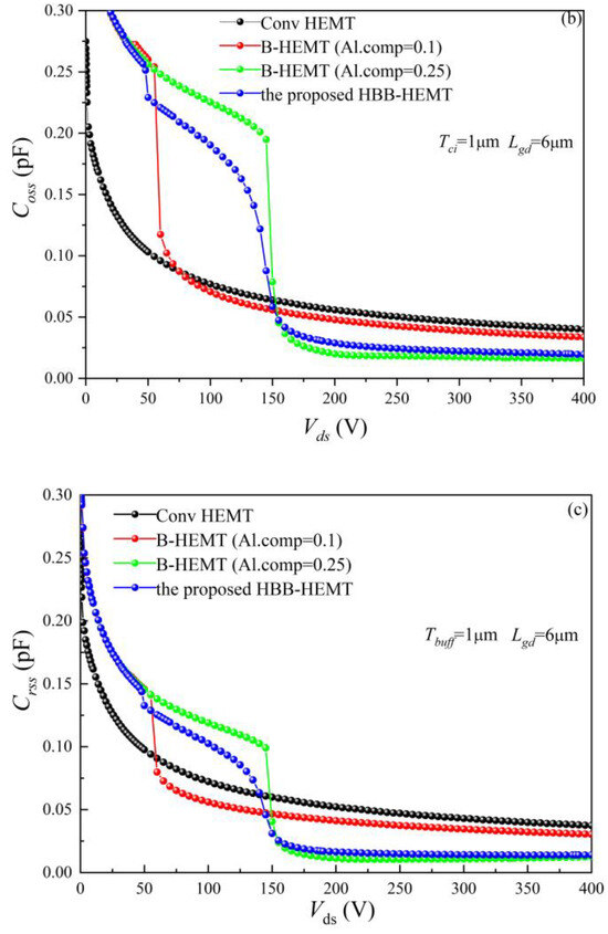 However, for GaN HEMTs with a back barrier, due to a more uniform distribution of electric field in the channel, the depletion region extends further towards the gate, leading to a reduction in Crss. From Figure 5a, it is evident that the Conv-HEMT exhibits the smallest depletion region area and thus the largest Crss capacitance. The depletion region of the B-HEMT (Al.comp = 0.1) does not fully extend to the drain, resulting in a larger Crss compared to the B-HEMT (Al.comp = 0.25) and HBB-HEMT. Furthermore, the presence of the back barrier enhances the confinement of the two-dimensional electron gas, thereby improving the gate’s control over the channel. Therefore, GaN HEMTs with a back barrier exhibit a slight increase in Crss at Vds = 0 V. In summary, Crss decreases for the HBB-HEMT at high drain voltages, which effectively improves the device’s performance for high-frequency applications.