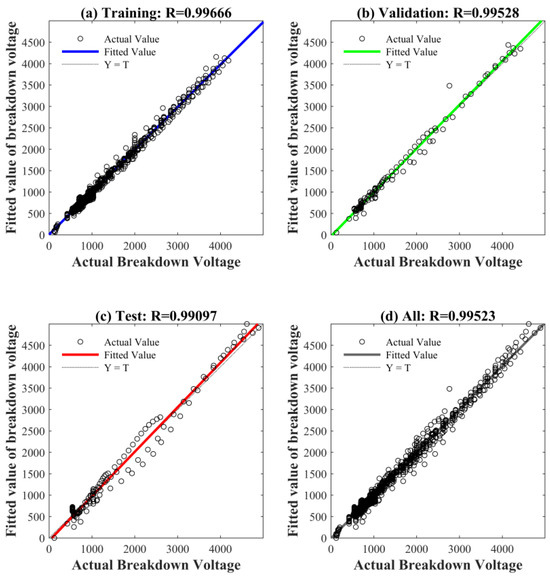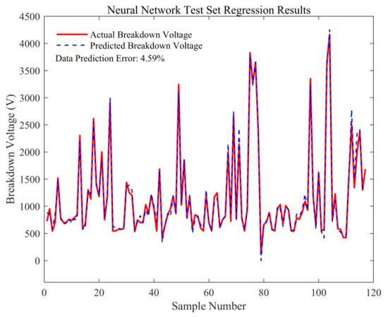 All simulation data were fed into the initial BP neural network model for training. Figure 12 shows the loss during the training, validation, and testing processes. When the number of iterations was greater than 7, the loss tended to be stable as the number of iterations increased. The final R coefficient values of the trained BP neural network model are shown in Figure 13. In Figure 13, the correlation coefficients R for the training set and validation set are both 0.99, which is close to 1, indicating the accuracy of the neural network model without significant overfitting. The correlation coefficient R for the test set is also 0.99, demonstrating that the trained model has sufficient generalization capability and accurate prediction ability. Figure 14 compares the predicted data from the BP neural network model with the simulation data. The average prediction error of the data comparison is 4.59%. Therefore, the BP neural network using the LM algorithm predicts the breakdown voltage of the HBB-HEMT very close to the actual values.