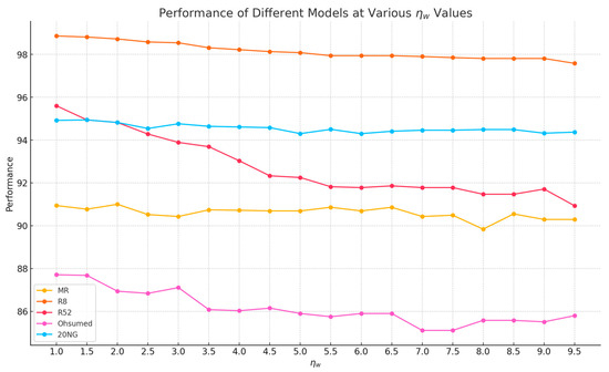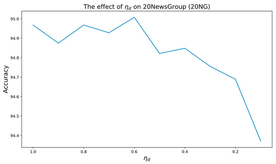With respect to the balance of the three weights, we have conducted an experiment on the 20NG dataset to justify the best weight combinations to achieve the highest accuracy. The best accuracy of 95.00% is produced at ηd = 0.6, ηw = 0.9, and ηc = 1.0. As shown in Table 3, the accuracy of 94.98% is produced by setting all three weights to 1.0. Like other studies, the best weight combinations in general correspond to the characteristics of the datasets. Thus, the optimal weight combinations require grid searches that minimize the loss function effectively and are diverse for different datasets.