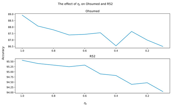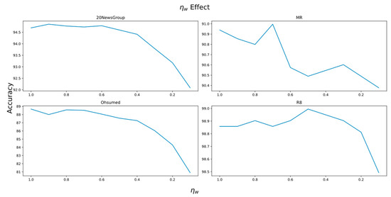 Note that we also investigate the effect when the weights are greater than 1.0. Figure 5 shows that the accuracy decreases as the weight of the word loss (ηw) increases for the 20NG dataset. The other datasets and the weights of document loss and class loss exhibit similar trends. Thus, weights are selected between 0.0 and 1.0 for our experiments.