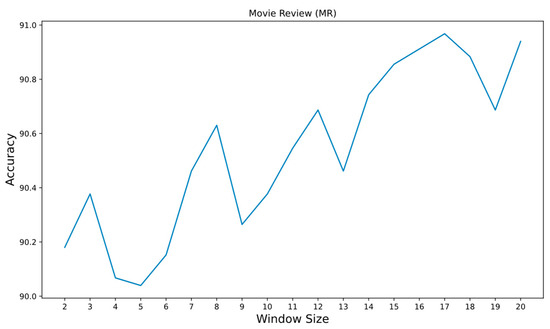 The effects of varying the window size are analyzed next. The experiment was conducted on the MR dataset, whose average length (number of words) is about 20. Figure 6 shows the results for the MR dataset, with the lowest accuracy being 90.05% (L = 5) and the highest accuracy being 90.95% (L = 17). Increasing the window size generally increases the accuracy. In text classification for short documents, a larger window size associates more words within the text. Consequently, the convolution process yields richer textual information, leading to more accurate inference of the document class. However, window size does not clearly impact accuracy for other datasets with longer texts. The range of accuracy varies as follows: for R8, from 98.7% (L = 2) to 99% (L = 9); for R52, from 95.5% (L = 16) to 96.05% (L = 13); for Ohsumed, from 87.3% (L = 7) to 89.6% (L = 2); and for 20NG, from 94.6% (L = 6) to 95.05% (L = 2). Therefore, for longer texts, a very large window size is unnecessary; with a sufficient number of edges, accuracy does not significantly differ thereafter.
