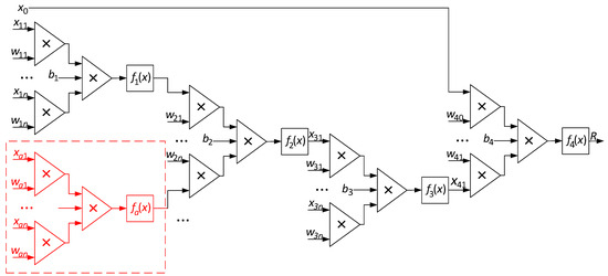 Taking into account the above, based on [37], a hierarchical neural network system is proposed for the helicopter TE residual resource model (Figure 2), in which “×” is a multiplier, Σ is an adder, R is a residual resource, fi is a nonlinear function defined according to (4), wij are the neuron’s weights, bi are displacements, and xij is the helicopter TE input thermogas dynamic parameter, which can either be recorded on board the helicopter or calculated analytically. For example, the gas generator rotor r.p.m., nTC, the gas temperature in front of the compressor turbine, , and the free turbine rotor speed, nFT, are recorded on board the helicopter. At the same time, for example, the air temperature behind the compressor, , and the total gas pressure behind the compressor turbine, , are calculated analytically according to the helicopter TE universal mathematical model [38]. Also in Figure 2, the blocks highlighted with dotted lines mean mathematical models (3), in which the presence of a particular defect is determined (for example, broken compressor blades, combustion chamber burnout, etc.). In Figure 2, the blocks highlighted with red dotted lines mean a changing atmospheric conditions mathematical model.