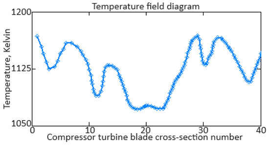 Diagram of the temperature field of a compressor turbine blade cross-section in a helicopter turboshaft engine (author’s research, based on [33]).
