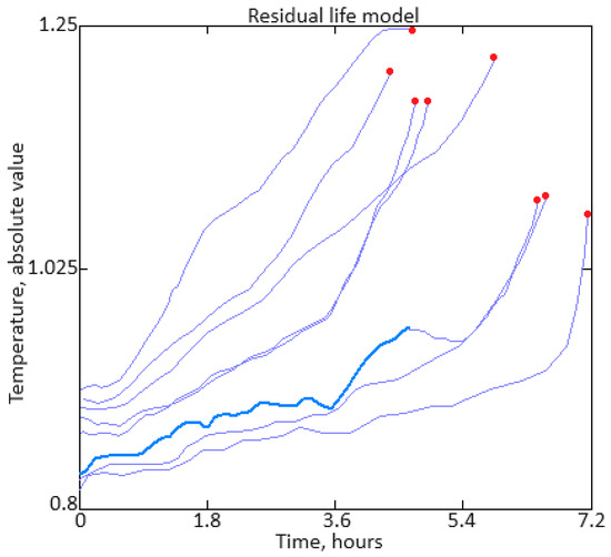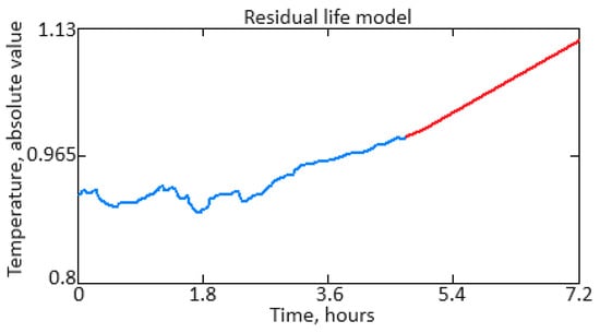 In Figure 5, the temperature values are given in absolute units (from zero to one) according to the gas dynamics similarity theory. The absolute temperature value exceeding one (the segment highlighted in red) is a signal of the possible destruction of the helicopter TE compressor turbine blades. The curved part of Figure 5, shown in red, means the maximum probability of destruction of the helicopter TE compressor turbine blades. This curve indicates a portion of a component wear critical level where the component failure likelihood reaches its peak, requiring immediate maintenance or replacement. Analysis of this segment makes it possible to identify potential risks in a timely manner and take preventive measures, which significantly increases the safety and reliability of helicopter operations. According to Figure 5, the destruction period of the helicopter TE compressor turbine blades will begin in 5.0 h.