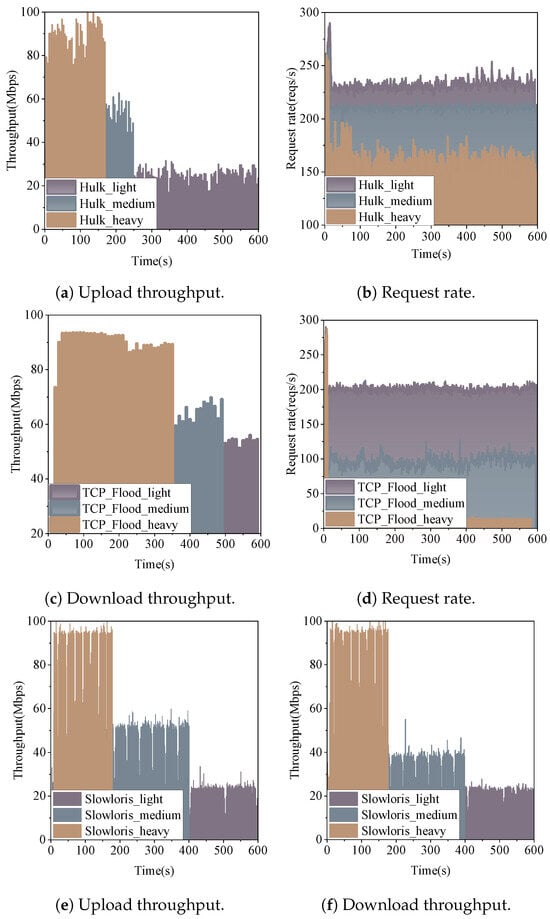 The Hulk attack tool [52] exploits HTTP’s characteristic that each request must be processed by the target server. This tool overwhelms the server’s bandwidth by sending numerous network requests, impairing its ability to respond to legitimate users’ requests. The Hulk tool launches the attack process through the startup parameter ‘-site’, which specifies the target website. Additionally, the parameter ‘-HULKMAXPROCS’ controls the attack scale by setting the number of goroutines. The web service’s network I/O upload throughput and client node’s request rate are effective indicators for evaluating the scale of the Hulk attack, as depicted in Figure 2a,b. During the light-scale Hulk attack, the web service’s I/O upload throughput is approximately 20 Mbps, and the client node’s request rate ranges from 225 reqs/s to 250 reqs/s. As the attack scale increases, the web service’s I/O upload throughput increases while the client node’s request rate decreases. In the heavy-scale Hulk attack, the web service’s I/O upload throughput reaches approximately 100 Mbps, representing the upper limit of system performance. Meanwhile, the client node’s request rate remains between 150 reqs/s and 175 reqs/s.
