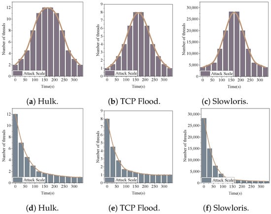 Examples of various attack scales conforming to probability distributions: (a–c) illustrate attack scales conforming to normal distribution, and (d–f) illustrate attack scales conforming to exponential distribution.