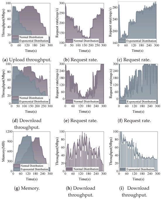 The effectiveness verification of multiscale attack patterns based on probability distribution is demonstrated in Figure 4. When the attack scale follows a probability distribution over time, its effective indicators are either proportional or inversely proportional to the probability distribution. As illustrated in Figure 4a,d,g–i, the attack scale increases or decreases over time, and the upload throughput, download throughput, and memory usage of the web service correspondingly increase or decrease. Conversely, as illustrated in Figure 4b,c,e,f, an increase in the scale of the attack over time results in a reduction in the number of available connections and a corresponding decrease in the request rate of the client node. Consequently, there is an inverse relationship between the request rate of the client node and its corresponding probability distribution. During the multiscale Hulk attack based on probability distribution, the I/O upload throughput of the web service is proportional to the probability distribution, while the client node request rate is inversely proportional to the probability distribution, as illustrated in Figure 4a–c. Similarly, during the multiscale TCP Flood attack based on probability distribution, the I/O download throughput of the web service is proportional to the probability distribution, while the client node request rate is inversely proportional to the probability distribution, as illustrated in Figure 4d–f. Finally, during the multiscale Slowloris attack based on probability distribution, both the web service memory usage and I/O download throughput are proportional to the probability distribution, as illustrated in Figure 4g–i.