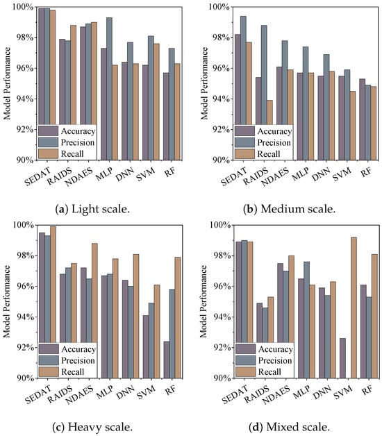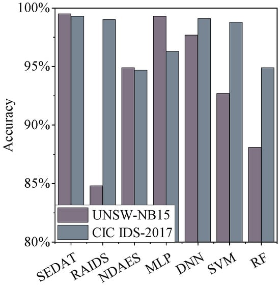 In this section, we set up several sets of comparison experiments to evaluate the SEDAT. The detection of network traffic anomalies can be seen as a classification task. We compare SEDAT with several intrusion detection models and conduct three experimental tests to verify the effectiveness of SEDAT. Additionally, we compare the results on the dataset proposed in this paper and common benchmark datasets (CIC IDS-2017 [25] and UNSW-NB15 [26]) to validate the advantages of SEDAT over traditional baseline methods. The following questions are addressed through experimental validation: