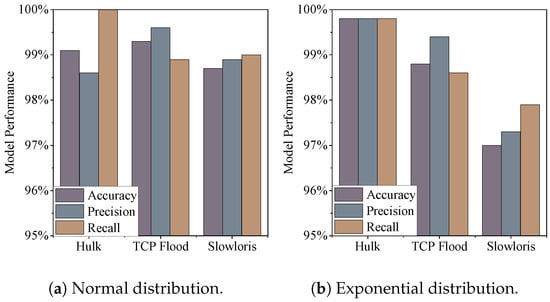 In this paper, , , , and represent the number of four results, respectively: true positive (): correctly classifies the attack sample as an attack sample; false negative (): incorrectly classifies the attack sample as a benign sample; false positive (): incorrectly classifies the benign sample as an attack sample; and true negative (): correctly classifies the benign sample as a benign sample. Given the aforementioned definitions, the definitions of accuracy, precision, and recall can be described as follows: