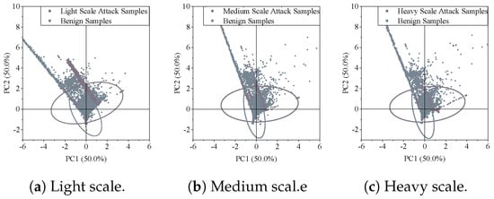 For Q3, the experimental results of this paper indicate that traffic generated by a medium-scale cyberattack is similar to benign traffic. The fuzzy samples above this scale tend to be classified as attacks. The fuzzy samples below this scale tend to be classified as benign. Therefore, medium-scale network attacks represent the bounds of the algorithm’s effectiveness.