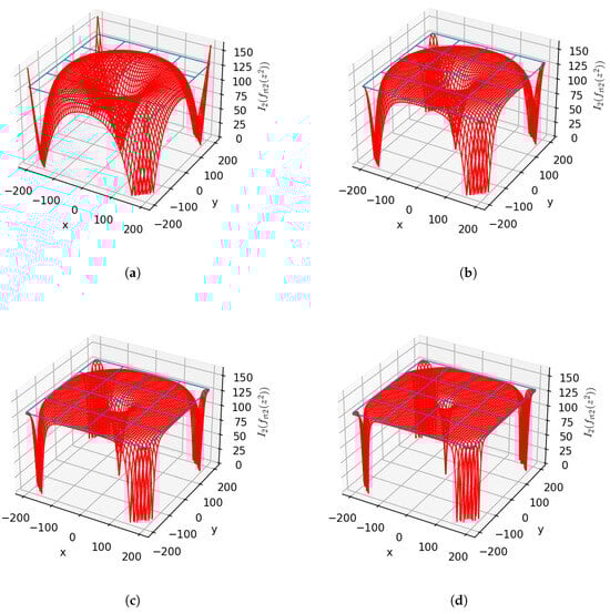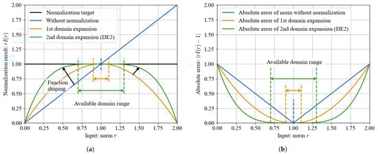 For , is experimentally confirmed to be appropriate in terms of continuity and domain expansion. This effect is shown in Figure 11a. Although is used here, the domain of definition can be further expanded close to by repeating , as shown in Figure 11b. Furthermore, we note that this is also true for large norms. This is because the norm is estimated to be smaller in the first iteration, even when it is large; as a result, the iterative computation is effective when the norm is large or small. This process extends the available input range to approximately .