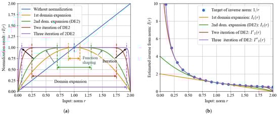 Pseudo-normalization using inverse norm approximation and its iterations. (a) Normalization effects of domain expansion and iteration. (b) Estimation results of inverse norm.