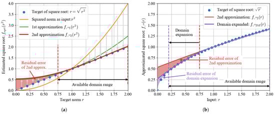 In the proposed method, we normalize vectors without using division. If the norm of the vector is , normalization is performed to find . Herein, we can consider normalization if we can compute the function , i.e., the inverse of the norm within a domain of a function by applying a multiply–add operation on r. As division is required to create in any domain, we consider pseudo-normalization as an approximation restricted to the domain of the function. The next section describes the design of the algorithm. First, we develop a low-cost approximation algorithm for each real number using the proposed residual correction method [31]. This method can be used to obtain a highly accurate approximate function within a defined region using only multiply–add operations. We then modify the algorithm for use to fixed-point numbers.