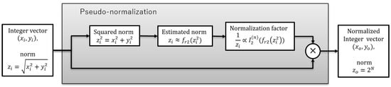 These are used to construct a pseudo-normalization algorithm. For any input vector of integers, the square of its norm is computed (Figure 4) using a simple multiply–add operation. The norm is then obtained by the approximate function of the square root. Finally, the reciprocal approximate function provides the final normalized coefficients.