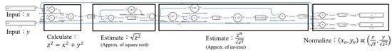 Subsequently, we describe the proposed normalization algorithm in Verilog, which is a hardware description language, and examine its computability for embedded systems. The basic circuit of the proposed algorithm in Verilog is shown in Figure 6. In addition, the inverse and root functions are shown in Figure 7 and Figure 8 as the basic modules. These bit-widths and constants are slightly adjusted to simplify the Verilog’s diagram, but do not affect the calculated results. The simulated operation is shown in Figure 9. In the simulation, is generated by assuming , and the magnitude of the inputs is changed from 0 to 200. The simulation results show that the output vector is almost constant in the range of the input magnitude . Normalization is performed to cancel the variation in .