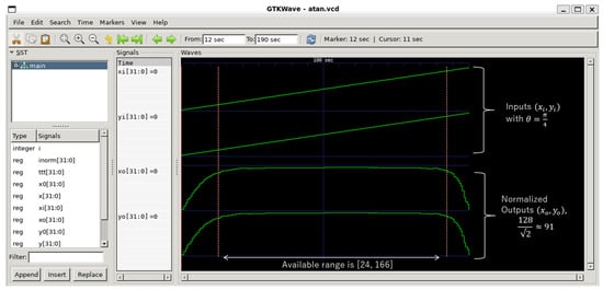 Finally, the proposed algorithm was implemented on an actual FPGA device to evaluate its computational feasibility and speed. The FPGA used was the DE0-nano (manufactured by Terasic Inc., Hsinchu, Taiwan), an evaluation board for INTEL’s Cyclone IV. The Verilog HDL source was the same as that used in the aforementioned simulation. Figure 10a shows the results. The experimental results show that the expression can be calculated. Figure 10b also shows the timing of the instant when a specific bit on the input becomes “1” and the instant at which a specific bit on the output becomes “1”. The FPGA used in this study is 50 MHz (sampling time 20 ns); this means that our algorithm can compute with only the electrical delay is less than one cycle. The proposed algorithm can be implemented using only combinational circuits, and does not require pipeline processing like sequential circuits, so it can be processed within one cycle in embedded circuits (such as FPGAs). Efficient computation with combinational circuits has been the subject of active research in recent years, including work on binary tree-based dividers, such as those proposed in [33]. A comparison with other similar vector normalization algorithms is shown in Table 1. Note that other similar algorithms are implemented as sequential circuits rather than combinational circuits; therefore, the evaluation methods are different. As the conventional algorithms require approximately 20 cycles, implementation in the same FPGA requires a computation time which is approximately equal to 400 ns. Our algorithm, which can be implemented using only combinational circuits for embedded circuits such as FPGAs, is very fast.