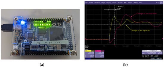 Implementation to FPGA and calculation speed evaluation. (a) Experimental implementation on FPGA. (b) Latency evaluation between input and output.
