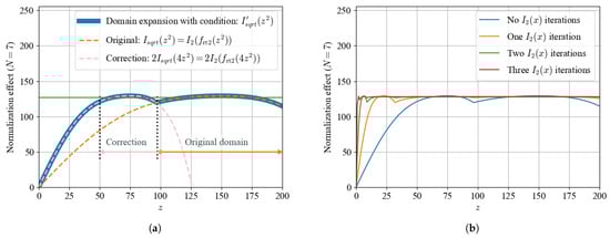 Further expansion of the domain using the residual correction method increases the computational cost owing to the strong nonlinearity of the original function; however, the error reduction effect is negligible. Therefore, we consider expanding the domain of definition by iteratively applying this approximate function. The application of once and its modification to is a more ideal state from the norm’s perspective with a reduced error. As shown in Figure 1b, this improvement can be obtained at all points except the endpoints of the region. Therefore, we consider the repeated application of as follows: