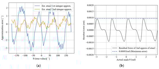 This encodes the angle as an intuitively understandable integer from to 180 degrees. The process flow of this calculation is shown in Figure 12. The details of the algorithm are the same as those provided in [13], except that the input and output are integers. Even if all approximations are made using integers (Figure 13a), the estimation error is within the quantization error, because it is less than or equal to 1°, although the resolution is increased for evaluation. The results with floating-point numbers, which have been reported in a previous publication [13], are shown in Figure 13b. The maximum error in the floating-point calculation was about rad (=0.05°), while the integer conversion resulted in an error approximately equal to 1 degree. This calculation is approximately three times faster than that of “math.h”, even when it is performed on a CPU with an FPU. Therefore, fast calculations can be expected even if a microcontroller without an FPU or compiler with low optimization capability is used.