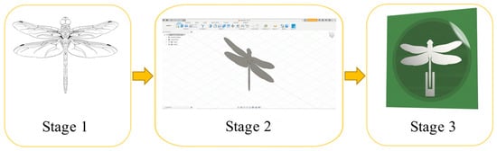 Step-by-step design process of the numerical model of the antenna: Stage 1 creating a graphic model of a dragonfly using the open-source drawing program Krita; Stage 2 creating a computer-aided (CAD) design using Autodesk Fusion 360; Stage 3 creating a numerical model by importing the CAD model into xFDTD.