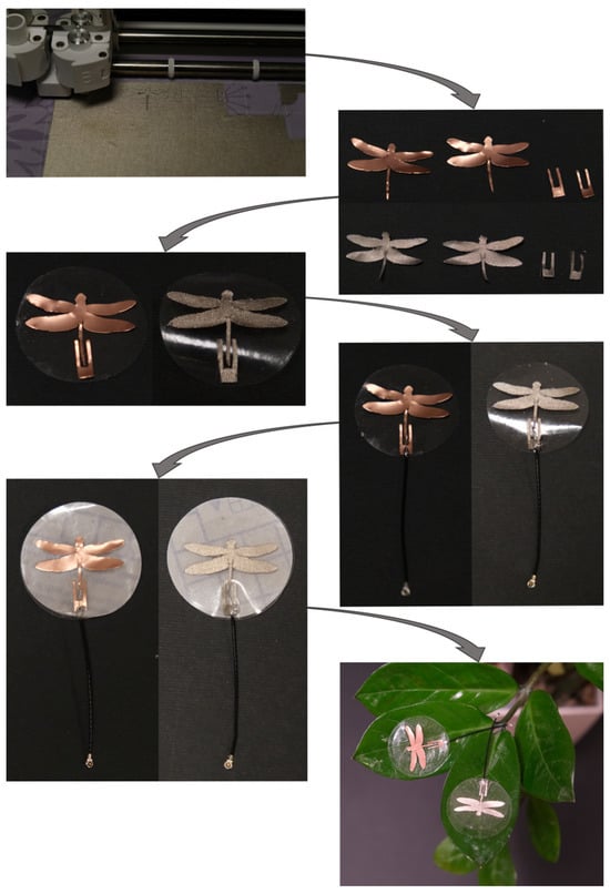 Figure 3 shows the layer-by-layer assembly process of the fabrication of two antenna prototypes. At the initial stage of the fabrication process, from the xFDTD final numerical model of the antenna, a CAD file of its conductive parts was created using CorelDraw (CorelDRAW X3 version 13.0.0.739). After that, the CAD file was exported to a cutting machine (Cricut Explore Air 2, Provo Craft and Novelty Inc., South Jordan, UT, USA) with a high accuracy of 0.01 mm. Next, the radiating elements and CPW were directly shaped on the P1168 conductive textile (for Prototype 1) and copper foil (for Prototype 2) using the cutting machine. Next, the antenna elements were assembled on the sticky part of the first layer of the polymer foil. Following this, a 0.81 mm mini-coaxial cable with a 50 Ohms W.FL connector was soldered to the CPW. A top encapsulation layer of the polymer foil was stuck onto the antenna elements, which was also created by using the cutting machine. Finally, the assembled elements were attached to a ZZ Plant leaf, as shown in Figure 4. It can be noticed that the fabricated prototypes of the proposed final antenna design are visually unnoticeable, flexible, waterproof and chemically robust. The prototype antenna is ultra-lightweight (Prototype 1 is 0.3 g and Prototype 2 is 0.4 g with attached coaxial cable) and with a small size, allowing for seamless integration into a plant-wearable device for the noninvasive wireless monitoring of individual plants’ physiological characteristics.