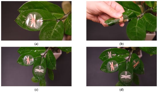 Recently, several flexible sensors placed on leaf surfaces have been fabricated and studied for monitoring plants’ physiological status [12,22,23], pesticide analysis [24,25], and plant growth [20,21,26]. Existing techniques for real-time monitoring of plant physiological characteristics or pesticide sensing typically involve a wearable plant sensor (attached to a plant leaf surface) connected by metal or silver wires to a system located outside the plant leaf surface, allowing for wireless remote data acquisition [12,24]. A wearable plant device for wireless leaf microclimate monitoring has also been presented in [22], but even though it has a flexible sensor, the antenna of the wearable plant device is on a rigid substrate. Consequently, despite the rapid development of wearable plant sensors designed for placement on leaf surfaces, the development of flexible and small plant wearable antennas is still in its infancy.