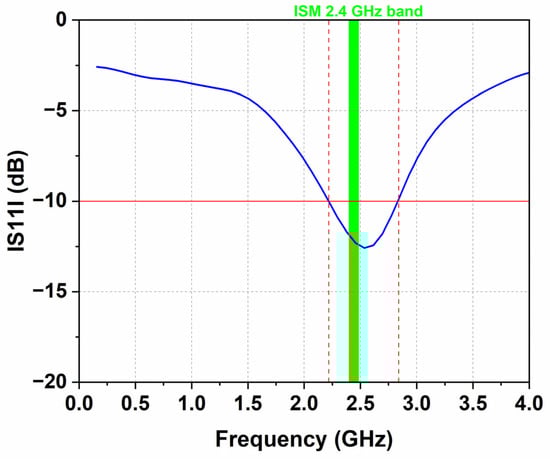 The simulated |S11| is shown in Figure 5. It can be seen that the proposed antenna exhibits a |S11| ≤ −10 dB band from 2.24 to 2.77 GHz.