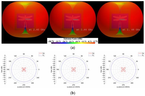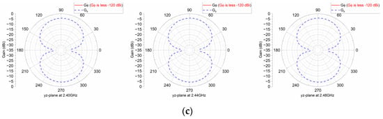 Simulated 3D radiation patterns of the proposed antenna at 2.40, 2.44 and 2.48 GHz: (a) 3D radiation patterns; (b) 2D radiation patterns in the xy plane; (c) 2D radiation patterns in the yz plane.