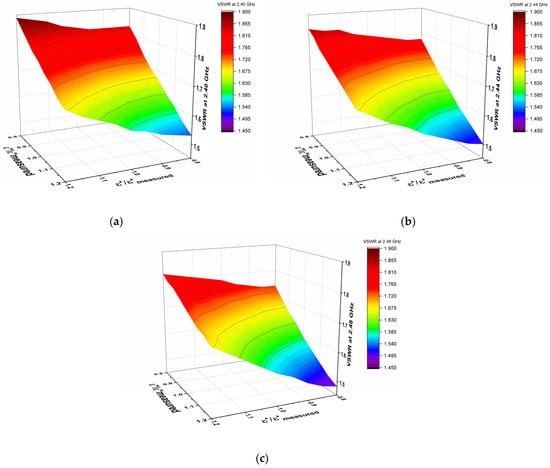 Simulated VSWR computed at a changing εr′ and εr″ of the antenna substrate up to ±20% concerning the measured values in Table 1: (a) at 2.40 GHz; (b) at 2.44 GHz; (c) at 2.48 GHz.